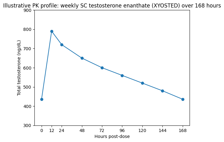 For weekly subcutaneous testosterone enanthate autoinjector (XYOSTED), FDA labeling specifies: start 75 mg once weekly, then titrate by 25 mg based on trough total testosterone measured 7 days after the last dose after 6 weeks (target trough range commonly 350–650 ng/dL). Label pharmacokinetics show a median Tmax ~11.9 hours and mean Cmax ~790 ng/dL, Cmin ~436 ng/dL, with steady state achieved by week 6.